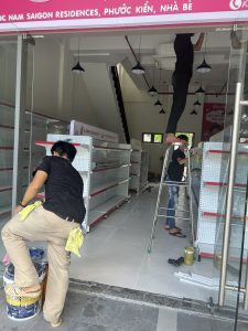 + Vệ sinh tường: dùng hoá chất, dụng cụ chuyên dụng tẩy các vết bẩn trên tường. Xử lý các vết sơn, keo bám trên cửa, kính, khung nhôm và làm sạch len tường.