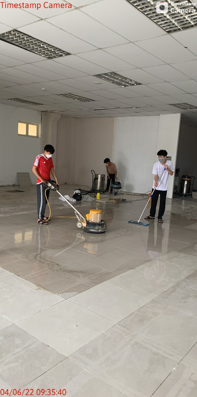 + Làm sạch sàn: sử dụng máy hút bụi công suất lớn, hút nước công nghiệp, máy đánh sàn, dụng cụ chà rửa, lau chùi, hóa chất… để làm sạch sàn.